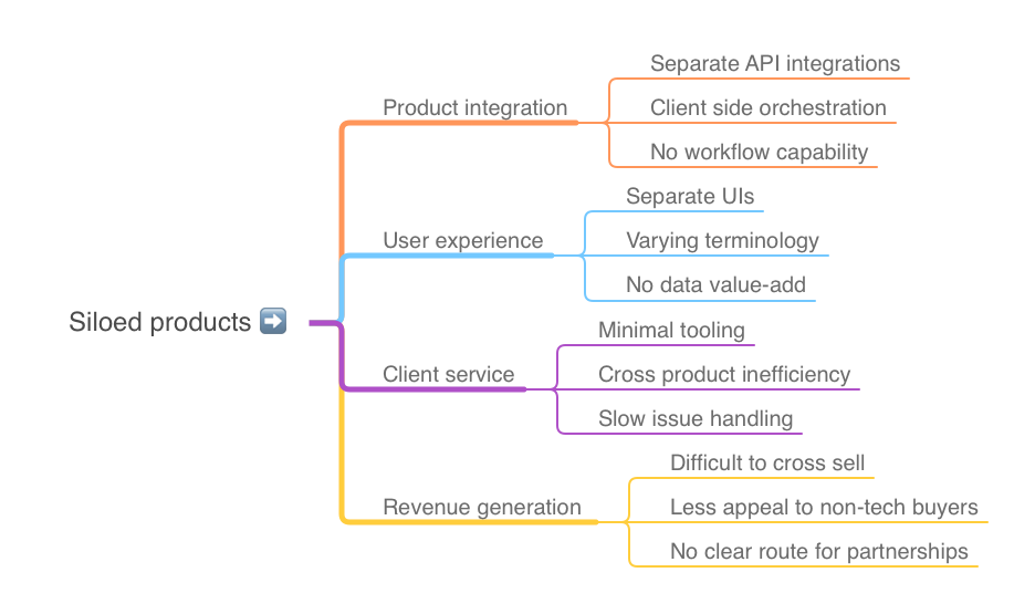 The net result of effects across product, UX and CX stands was that our revenue team struggled to cross sell our products. Given the high levels of incumbent market penetration and the long sales cycles our ability to get early adopters to take multiple products was key to achieving our revenue targets. Beyond the cross-sell difficulty there was also the top-of-funnel problem of increasing deal flow outside of tech-first platforms that we had had early success with. To get broader appeal within more traditional enterprise, we needed to both make integration easier and open up a pathway for integration partnerships with the big 4 consultancies that most of our ICP prospects were deeply embedded with.