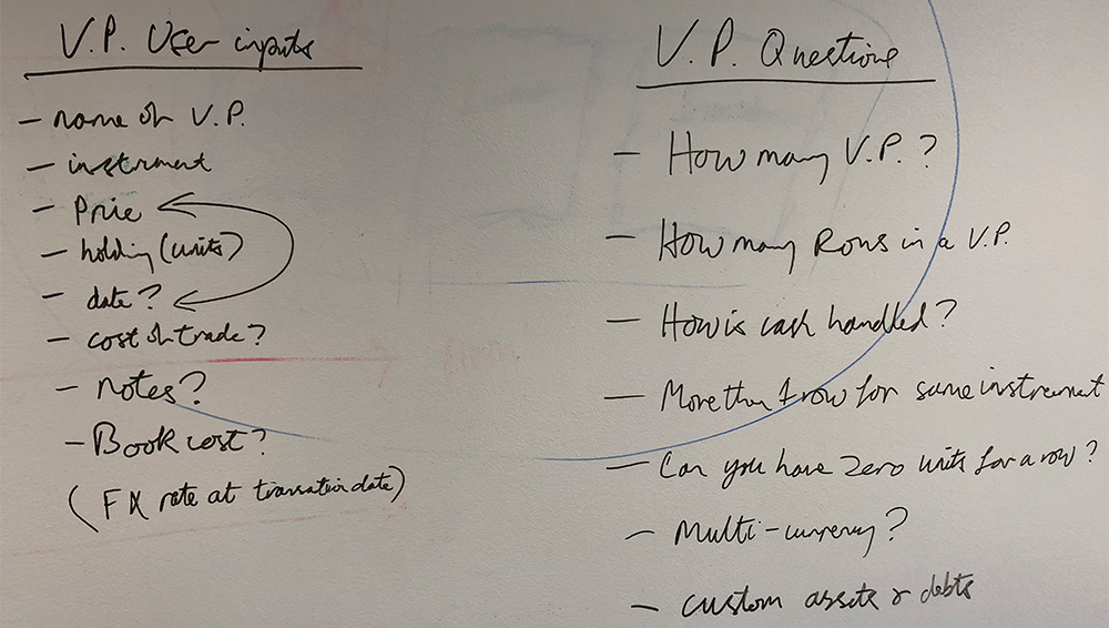 Before we started engagement with our users we formed the hypothesis that the majority of our users were using VPs either to test out potential investments/portfolio combinations or to manually replicate real money portfolios held elsewhere. From here we wrote up a series of key questions, where answers would guide us to a workable design.